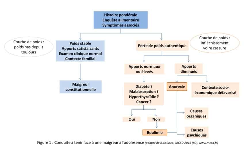 Face à une maigreur à l’adolescence, elle propose la démarche diagnostique suivante, permettant de déceler une anorexie mentale (cf. figure 1).