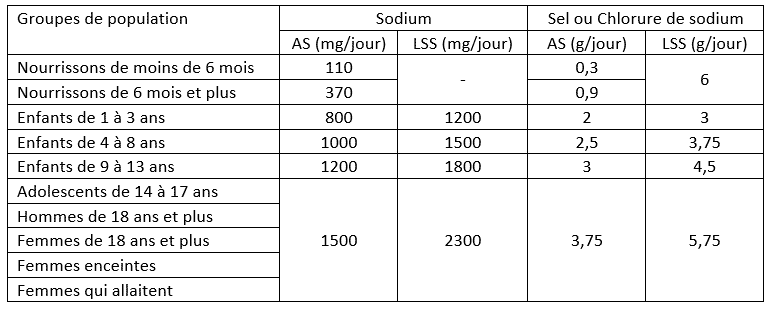 L’ANSES a donc décidé de fixer une référence nutritionnelle « inférieure » de type « Apport Satisfaisant (AS) » et une référence nutritionnelle « supérieure » de type « Limite Supérieure de Sécurité (LSS) ». Le tableau ci-dessous rappelle ces valeurs pour les différentes catégories de population, les chiffres sont donnés pour le sodium, l’équivalence en « sel » est également précisée.